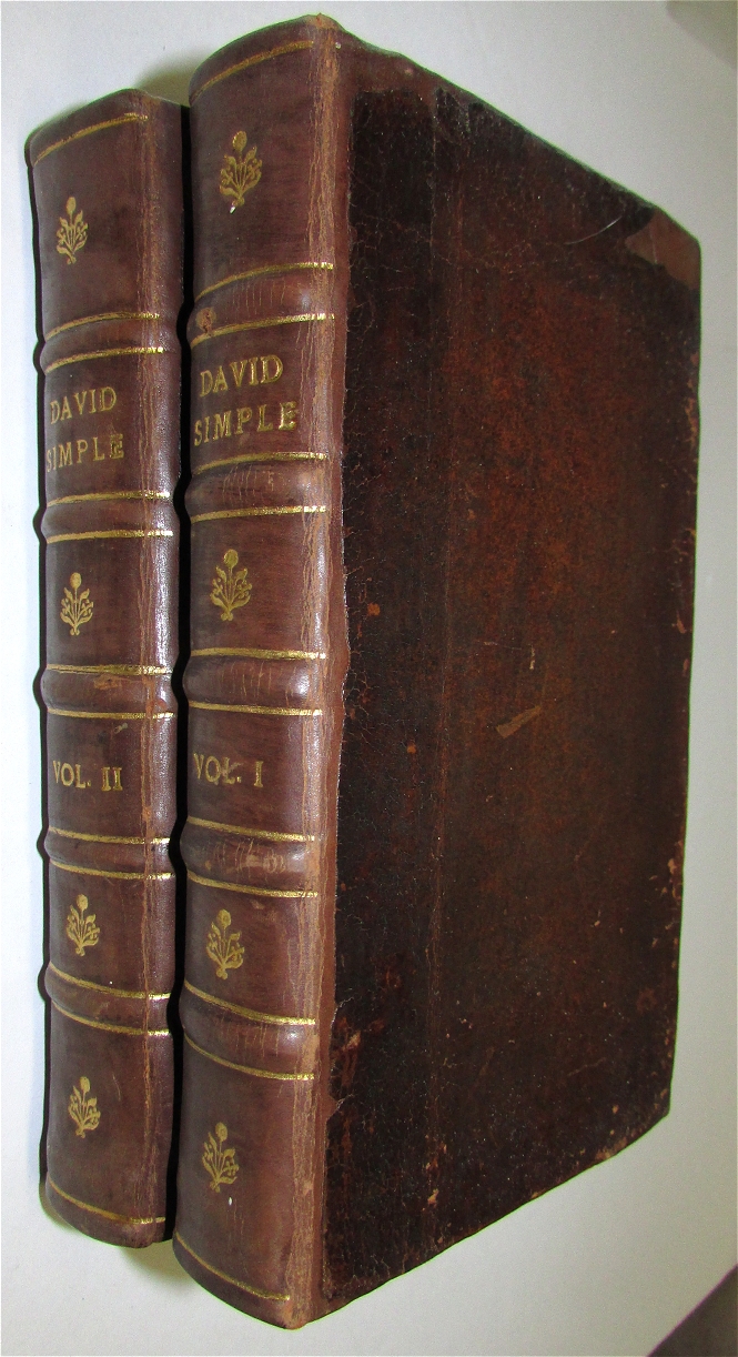 The Adventures of David Simple: Containing an Account of His Travels Through the Cities of London Westminster, in Search of a Real Friend. By A Lady..... London: Printed for A. Millar, 1744. In two volumes. First edition. 12mo., full contemporary calf, this copy has been professionally rebacked with more recent calf spines, x, (278); (ii), 322pp. Rebacked as noted above o/w a very good, clean copy. Sarah Fielding [1710-1768] novelist and scholar. Field was the sister of novelist, Henry Fielding and her "private income could not keep her from poverty and partial dependence on her brother....the preface to David Simple, her first work, explains that she writes because of financial difficulties." Fieldings works are mainly fiction of various types; the above has a picaresque structure and a sentimental theme. The hero searches through London for a friend, meeting only hypocrites until he finds Cynthia, Valentine and Camilla. "Feminist ideas are expressed in David Simple by Cynthia, who tells of the prejudices against an intelligent girl and descries her comic rejection of a pompous suitor. Fielding defends learned women by presenting them as gentle, attractive and dutiful."