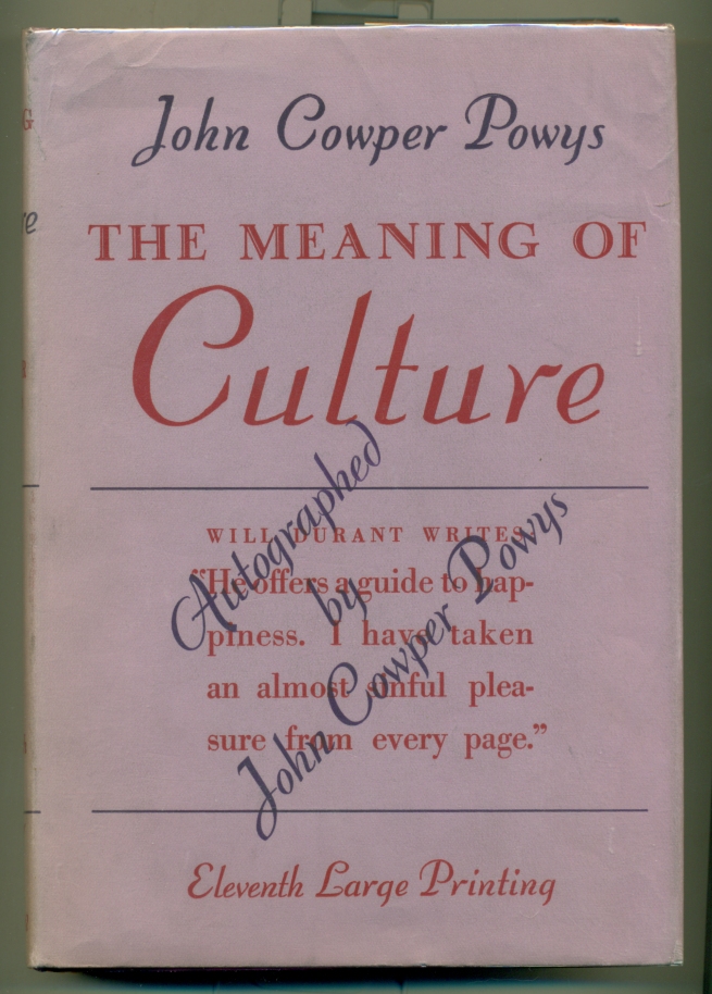 The Meaning of Culture. New York: W.W. Norton & Company, no date. "Eleventh Large Printing" stated on the d/w. Signed by Powys on the e/paper, the d/w stating "Autograhed by John Cowper Powys. Fine ina near fine d/w. Thomas does not note the d/w.