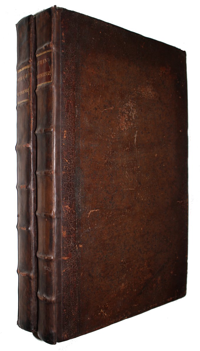 Athenae Oxonienses. An Exact History Of All The Writers and Bishops Who have had their Education in The most ancient and famous University Of Oxford From The Fifteenth Year of King Henry the Seventh, Com. 1500, to the End of the Year 1690. Representing The Birth, Fortune,...........of all those Authors and Prelates.....To which are added, The Fasti or Annals, of the said University, For the same time. London: Printed for Tho. Bennet at the Half-Moon in S. Pauls Churchyard, 1691-1692. In two volumes. First edition. Folio, full contemporary calf, leather spine labels, (8), 904 (in columns, 2 pp. per side of each leaf) , (1), (8)pp; (6), 906 (in columns 2 pp. per side of each leaf), (10)pp. [a2, B-N4, O2, P-2R4, 2S-4G2; A2, B-2X4, 2Y-4E2.] This copy has been rebacked in the 19th century with an earlier leather label laid down on the spine, some minor wear but in fact a near fine copy. Anthony Wood [1632-1695] English antiquary educated at Merton College. He obtained permission to use the Bodleian and then began systematically to copy monumental inscriptions and for antiquities in the city and neighbourhood. The keeper, Dr. John Wallis allowed him access to the University registers in 1660 and this work became the foundation for his later History and Antiquities of Oxford. In 1678 the registers that had been in his for eighteen years were removed, s it was feared that he would be implicated in the Popish plot. During this time he worked on his great work, the above title, published in 1691-92. "Wood's Athenae is an invaluable work, both as respects biography and bibliography...." (Lowndes).