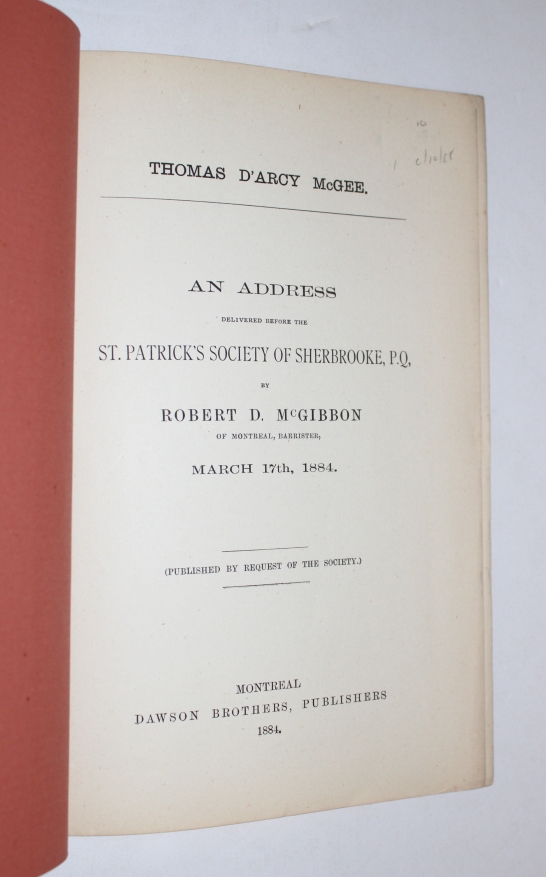 Thomas D'Arcy McGee. An Address Delivered Before the St. Patrick's Society of Sherbrooke......March 17th, 1884.