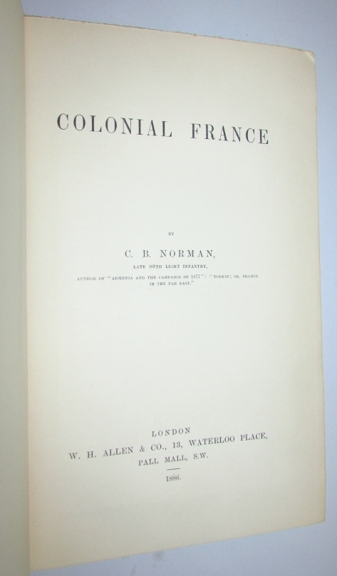 Includes sections on French settlements in Africa, settlements in the Indian Ocean; the East Indies; islands in the Pacific; Cochin-China, Annam and Tonkin; Martinque; Guadaloupe; French Guiana; Saint Pierre and Miquelon; Madagascar; Obock; Tunis; as well and information on colonial defence and financial administration. $200 CAD