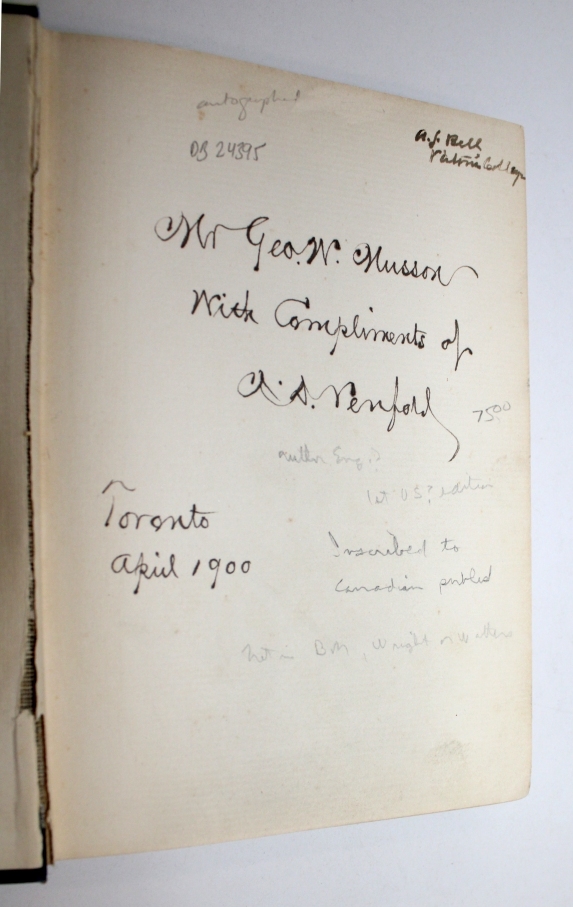 New York: The Knickerbocker Press, 1899. First edition. With a presentation inscription to Canadian publisher, Musson.