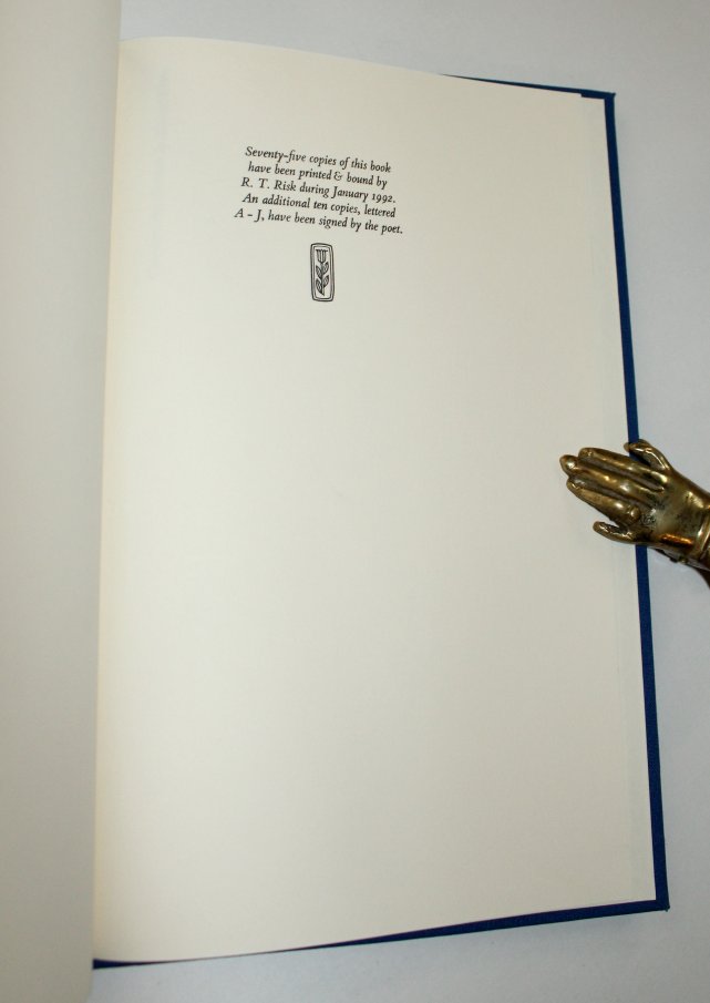 (Francestown, New Hampshire): Typographeum, 1992. 1 of an edition of 85 copies, this is 1 of 75 regular copies. With a one page printed prospectus laid in.