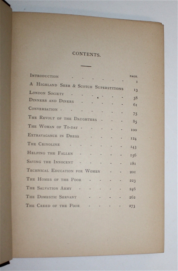 A peculiar book which address a number of topics ranging from Highland Seer & Scotch Superstitions, to London Society, to matters of etiquette such as dinners, dress etc. The author also address the woman question with chapters on helping the fallen, technical education for women, etc. $85 CAD