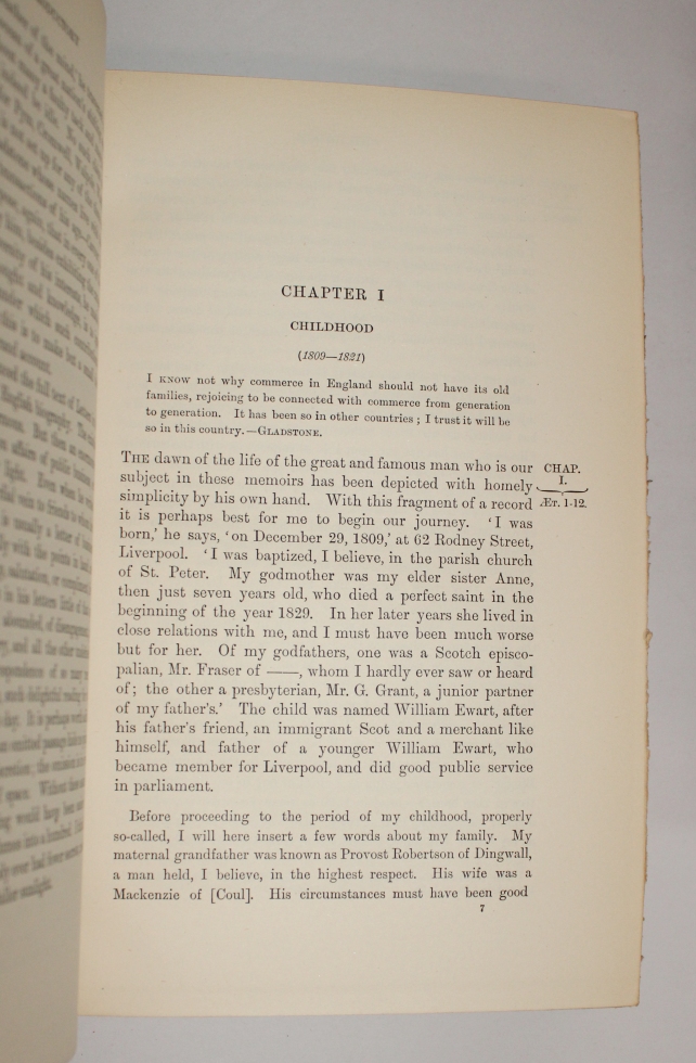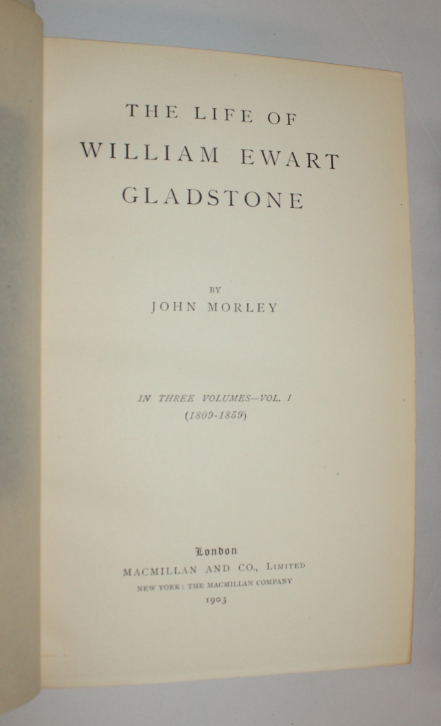 This is the "most important and arduous literary task of John Morley's life, the official biography of Gladstone." Begun in 1898, it was published in 1903 to a "reception by the public that surpassed all expectations." $650 CAD