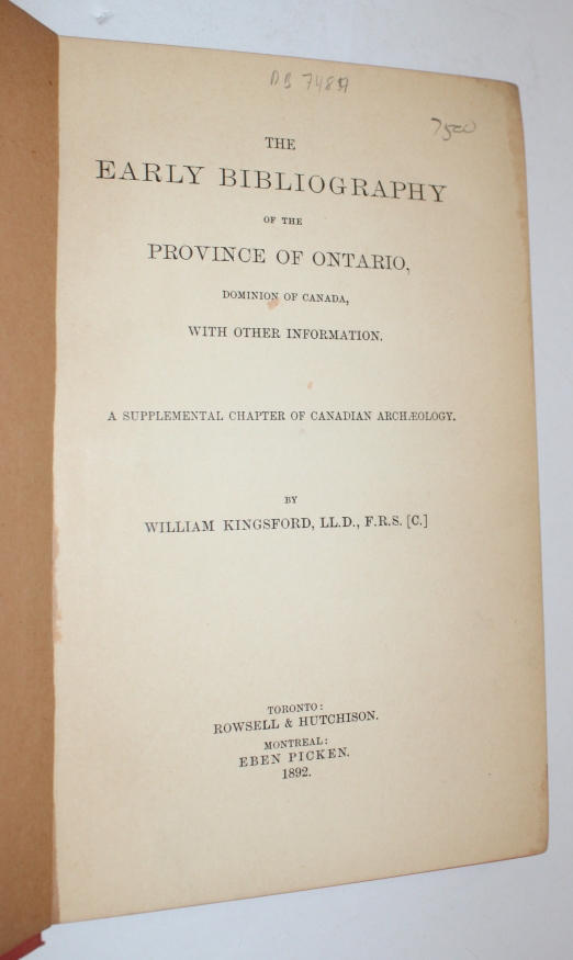 KINGSFORD, William. The Early Bibliography of the Province of Ontario, Dominion of Canada With Other Information. A Supplemental Chapter of Canadian Archaeology.