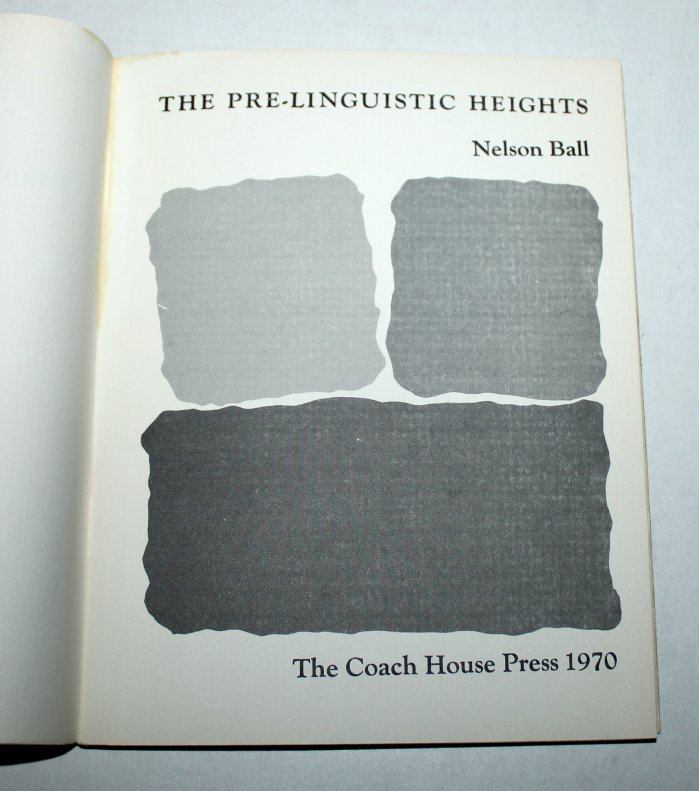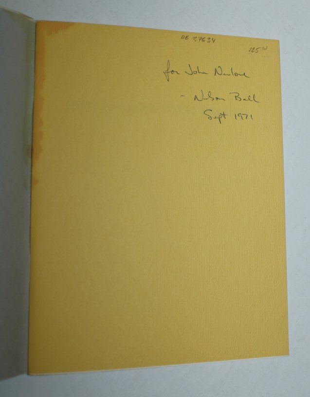 (Toronto): Coach House Press, 1970. First edition. Inscribed by Nelson Ball to Canadian poet John Newlove, with Newlove's signature on the inner wrapper. 8vo., orig. grey wrappers, (40)pp. Mark on the e/paper o/w a very nice copy in the very good d/w designed by Barbara Caruso. $125