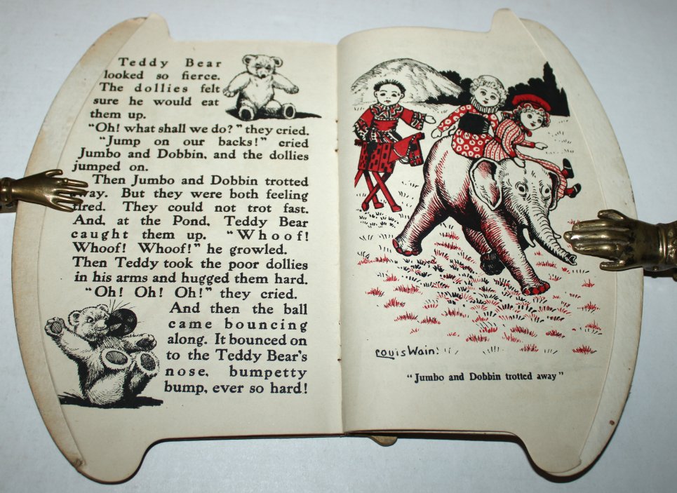Dundee and London: Printed and Published by Valentine & Sons, nd (192-?). ‘Valentine's Rocker Books'. Die-cut book (25 x 21cm) in the shape of a sitting teddy bear on a rocking base, colour pictorial heavy boards stapled, with 16pp. of text with full-page illustrations bound between the boards. The bear has eyes that move when the book rocks. Ownership name on verso of upper board, some wear to the edges, one eye moves more freely than the other, but certainly a very good copy of this ‘rocker' book. $250