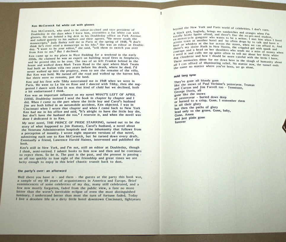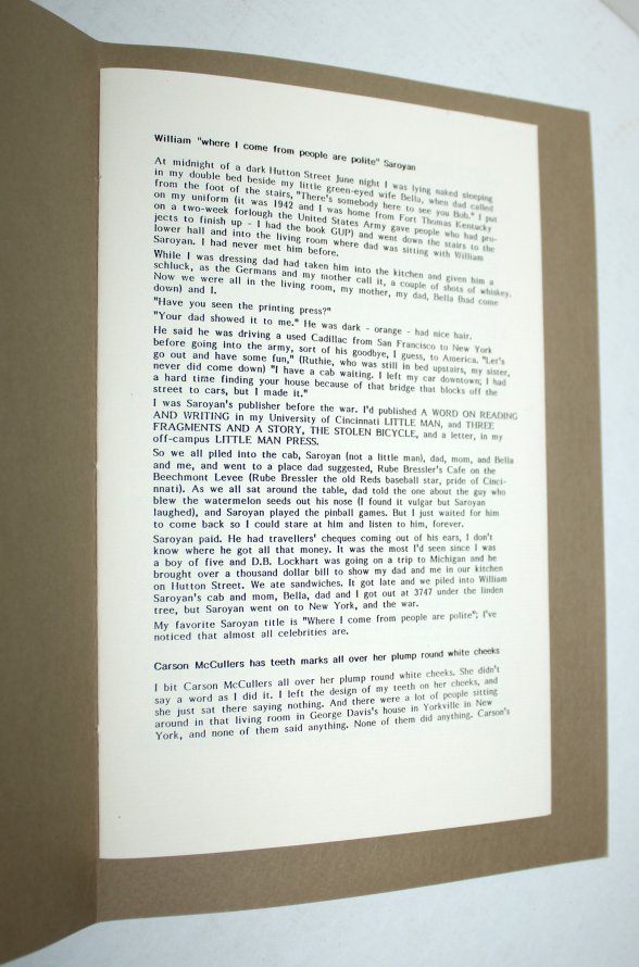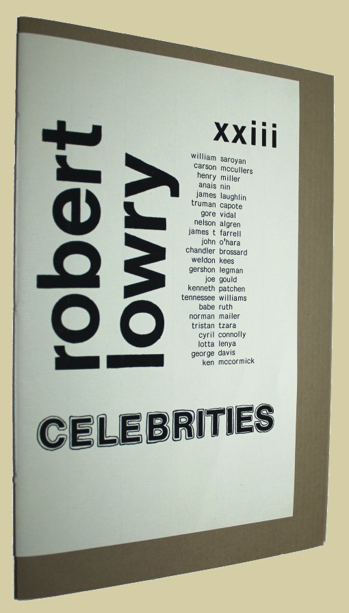 Short recollections by Lowry of celebrities such as William Saroyan, Carson McCullers, Henry Miller, Anais Nin, Gore Vidal, Tennessee Williams, and others. Most of the recollections are a paragraph long, but some are longer. $175