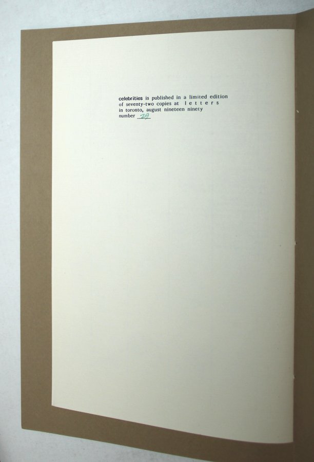 (Toronto: Letters Bookshop, 1990). 1 of 72 copies. Tall 8vo., orig. tan wrappers sewn with a printed panel wrapping around the wrappers, (12)pp.