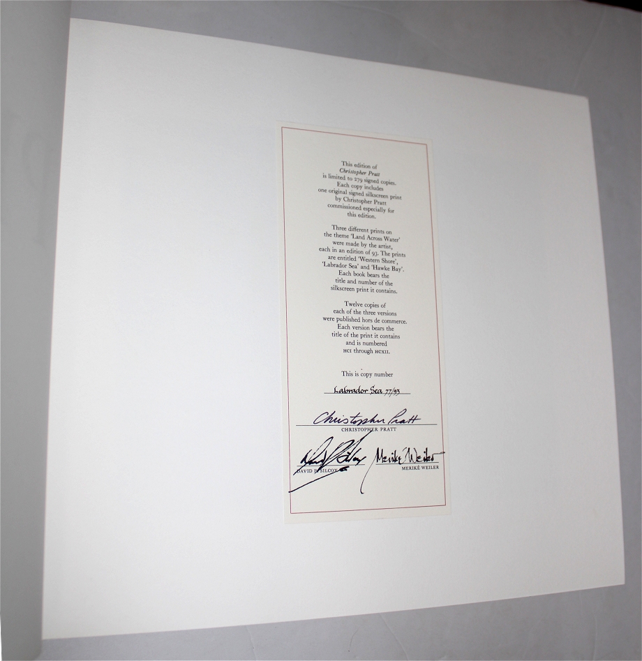 Toronto: Quintus Press, 1980. First edition. Limited to 279 copies (and 12 copies hors commerce). With an original silk screen print titled "Labrador Sea." Both the print and book are signed by Pratt. Small folio, bound in quarter oasis niger and cloth (linen), 192pp. With 60 illustrations in colour and 16 in black and white. A fine copy in the original folding slipcas bound in linen--the slipcase has some minor soiling.