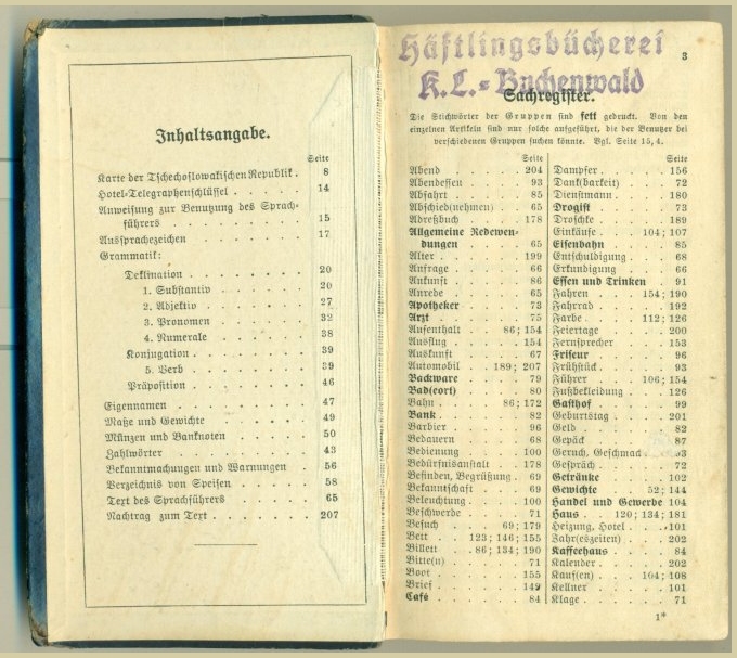 It turns out its value lies elsewhere. A large rubber-stamped identification at the top of the title page changes a worthless, badly defective, out-of-date grammar guide into a cultural artifact of immense and sombre significance. The rubberstamp on the title says, in that ponderous Gothic script the Germans so love, “Häftling bücherei. – K.L. Buchenwald.” Without any German I knew what it meant in English: Buchenwald – Prisoner's Library . To compound the indignity, in the rear I found a pencilled list noting withdrawal dates. The last had occurred on July 7, 1942.