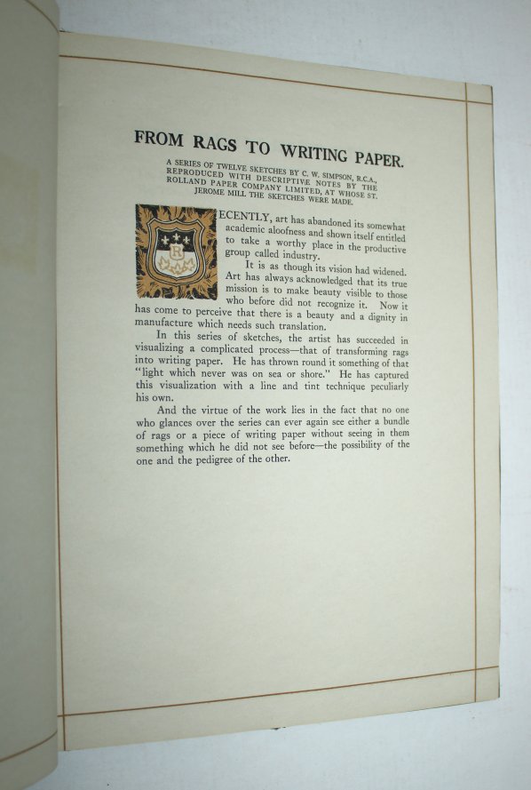 "A series of twelve sketches by C.W. Simpson, R.C.A., reproduced with descriptive notes by the Rolland Paper Company Limited, at whose St. Jerome Mill [Quebec] the sketches were made." $125