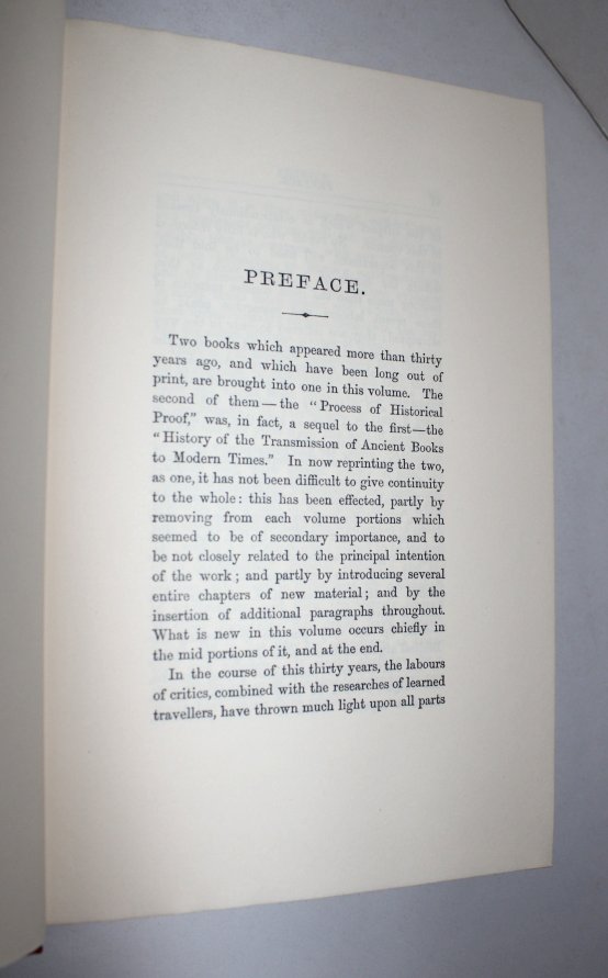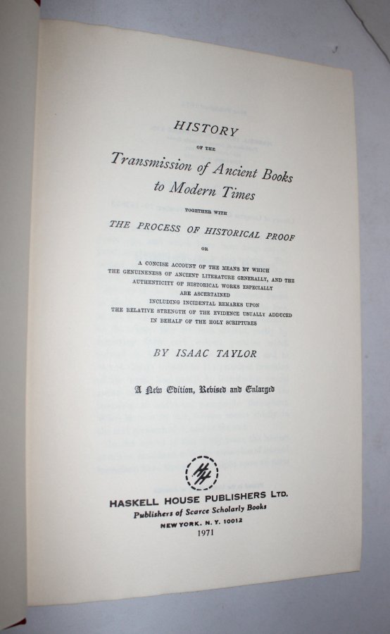 TAYLOR, Isaac. History of the Transmission of Ancient Books to Modern Times Together With The Process of Historical Proof...