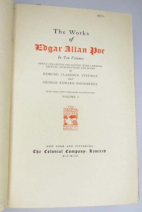 POE, Edgar Allan. The Works of ... Newly Collected and Edited, with a Memoir, Critical Introductions and Notes by Edmund Clarence Stedman and George Edward Woodberry.