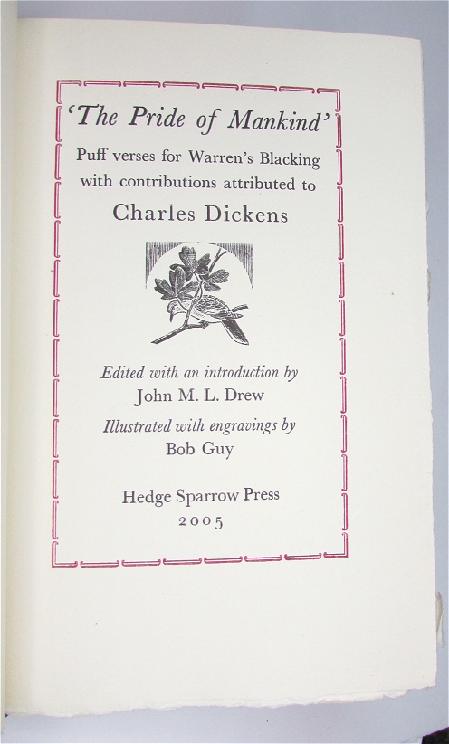 (DICKENS). ‘The Pride of Mankind' Puff verses for Warren's Blacking with contributions attributed to Charles Dickens. Edited with an introduction by J.M. Drew. Illustrated with engravings by Bob Guy.