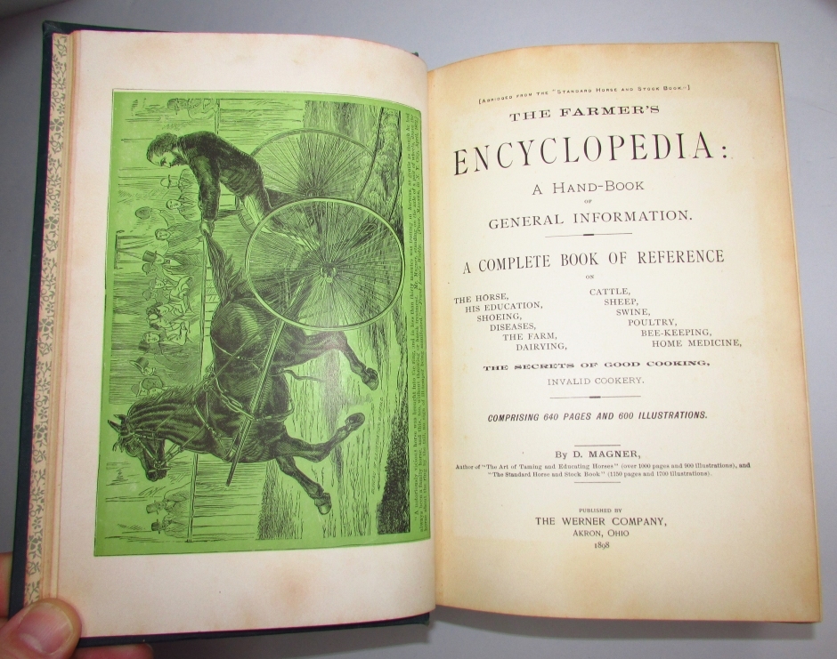 MAGNER, D. The Farmer's Encyclopedia: A Hand-Book of General Information. A complete book of Reference on the Horse, His Education, Shoeing, Diseases, the Farm, Dairying, Cattle, Sheep, Swine, Poultry, Bee-Keeping, Home Medicine, the Secrets of Good Cooking, Invalid Cookery.