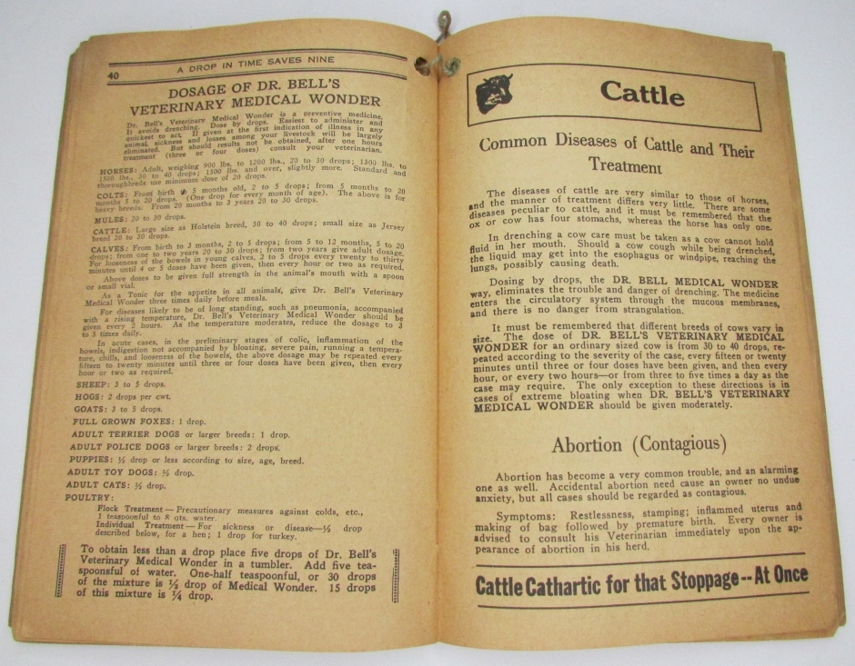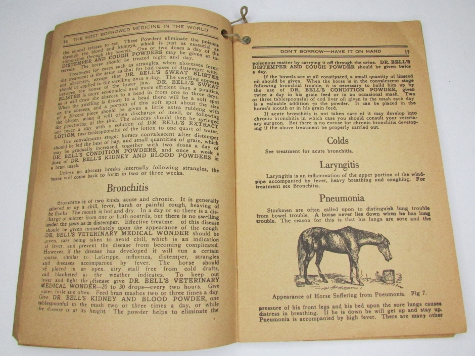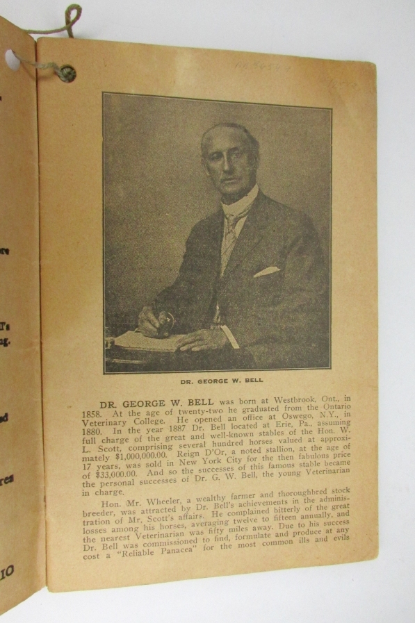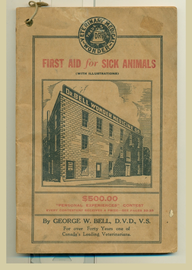 Dr. George Bell [1858-1927] graduated from the Ontario Veterinary College in 1880 and practiced in the United States before settling in Kingston. He produced patent medicines for the use in farm livestock and pet animals that were sold under the name ‘Dr. Bell's Wonder Medicine' and which were used as a sort of ‘cure all' but especially in the treatment of colic and inflammation. After his death in 1927, the patent medicine company continued under his son's guidance, expanding from treatments for horses, farm animals and pets to include household cleaners, as well as medicines for human consumption. This pamphlet is devoted to the diseases and illnesses of horses, cows and swine, and the relevant products produced by ‘Dr. Bell's Wonder Medicine Company.'