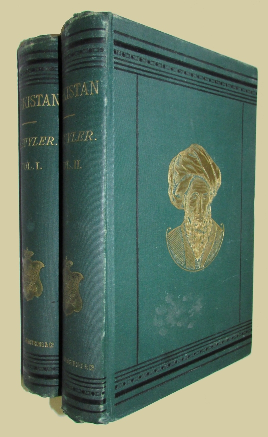 Turkistan. Notes of a Journey In Russian Turkistan, Khokand, Bukhara, and Kuldja. New York: Scribner, Armstrong & Co., 1877. In two volumes. Second U.S. edition. Tall 8vo., orig. green cloth with a pictorial gilt decoration on the upper covers, xii, 411; viii, 463pp. Some light wear to the spine ends o/w a very nice set. Eugene Schuyler [1840-1890] American diplomat & scholar into a prominent New York state family, he enjoyed every cultural, social and political advantage. He graduated from Yale and then Columbia law school and began to practice in 1863. Schuyler's interest in languages caused him to apply for a diplomatic posting and in 1867 he was appointed Counsel to Moscow. During the succeeding nine years he served in a variety of posts including Revel, Saint Petersburg and Constantinople. While he held the latter post he wrote a influential report documenting Turkish atrocities in Bulgaria. In 1880 he became the first American diplomatic representative to Rumania. He eventually returned to the United States and lectured at Cornell and Johns Hopkins. The above work was first published in 1876 and was critical of the Russian administration in the East. It also provides an account of his travels in Central Asia, with chapters on Tashkent, Samarkand, the Syr, Darya, etc.