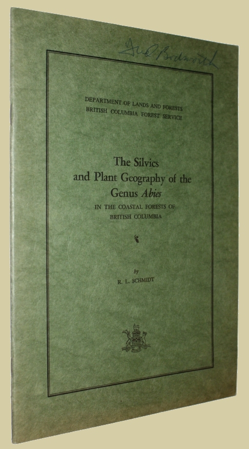 The Silvics an Plant Geography of the Genus Abies In the Coast Forests of British Columbia. (NP): Department of Lands and Forests, British Columbia Forest Service, (1957). From the library of Canadian writer, Fred Bodsworth, with his signature on the upper wrapper. Tall 8vo., orig. green wrappers, 31pp. Indentations from paperclips on a few pages o/w very good.