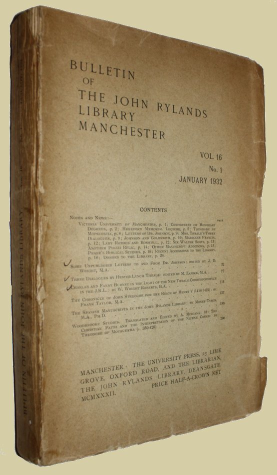 Bulletin of the John Rylands Library Manchester Vol 16 No. 1, January 1932. Manchester: The University Press, 1932. Tall 8vo., orig. printed wrappers, 319pp. Wrappers chipped and worn, a good copy.