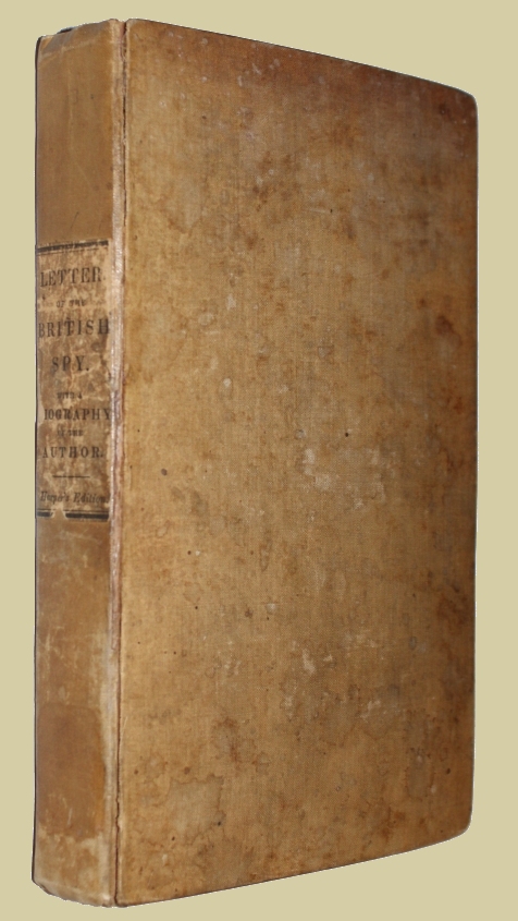 The Letters of the British Spy. To Which is Prefixed a Biographical Sketch of the Author. New York: Printed and Published by J. & J. Harper, 1832. Tenth edition, revised and corrected. 8vo., orig. cloth, paper spine label, 260, 4pp.ads. Foxing throughout, library blindstamp on title,cloth faded with some staining but still a good copy.