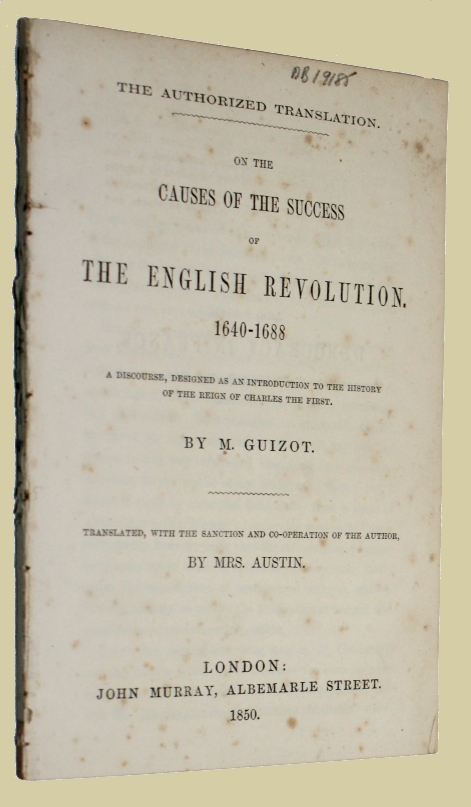 On the Causes of the English Revolution 1640-1688. A Discourse, Designed as an Introduction to the History of the Reign of Charles The First. Translated, With Sanction and Co-Operation of the Author By Mrs. Austin. London: John Murray, 1850. 8vo., disbound (no covers), 80pp. Disbound (needs to be rebound) o/w a nice copy.