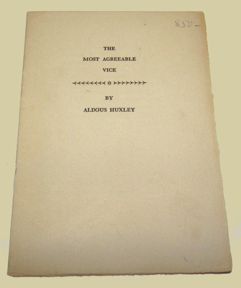 The Most Agreeable Vice. (Los Angeles Ward Ritchie Press, 1938). First edition. 1 of 500 copies. Printed for Jake Zeitlin to celebrate the 'opening of my new book-shop.' Inscribed by Zeitlin to Richard Marshall of the bookselling firm Bennett & Marchall. 12mo., orig. wrappers, 7, [1] p. A fine copy of this Huxley rarity. In a slipcase (which has a piece of red morocco pasted over the original blue morocco spine. The inner flap of the slipcase has the bookplate of journalist and newspaper publisher, 'James Strohn Copley'. Los Angeles bookseller, Michael Thompson, described this as 'a notorious rarity' adding that 'many were stolen on opening-night.'