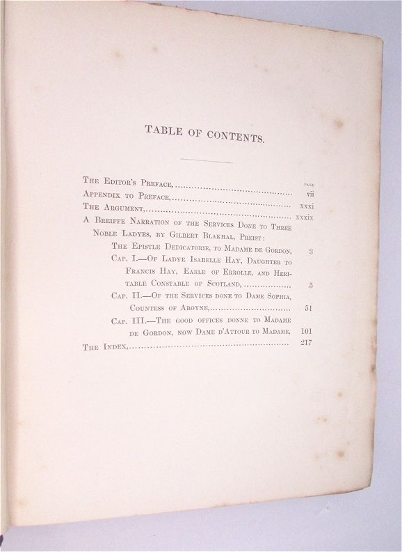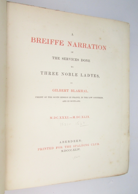 Not much is known about Blakhal. He was part of the Roman Catholic Mission in Scotland. "The narrative of Father Blakhal is, on the whole, a considerable addition to our history of the eventful times during which he lived. The intercourse which he held with persons of all ranks and professions, princes and peasants, ....in such stirring times could not fail at attending an interesting subject. Many little pictures of the manners and state of society in Scotland and France will be found scattered throughout the narration...." "The volume has been printed from the original mss. (in the author's hand)." The work is divided into three main sections: "Of Ladye Isabelle Hay, daughter to Francis Hay, Earle of Errolle, and Heritage Constable of Scotland," II: "Of the Services Done to Sophia, Countess of Aboyne by Gilbert Blakhal," III: "The Good Offices Donne to Madame De Gordon, ... By Gilbert Blakhal." $250 CAD