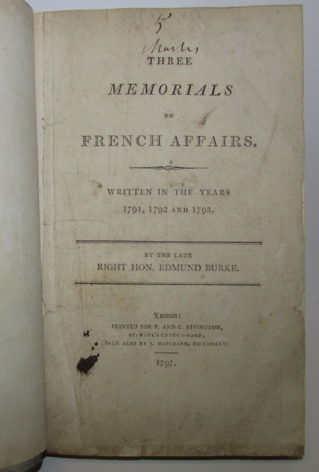 BURKE, Edmund. Three Memorials On French Affairs. Written In The Years 1791, 1792 And 1793.