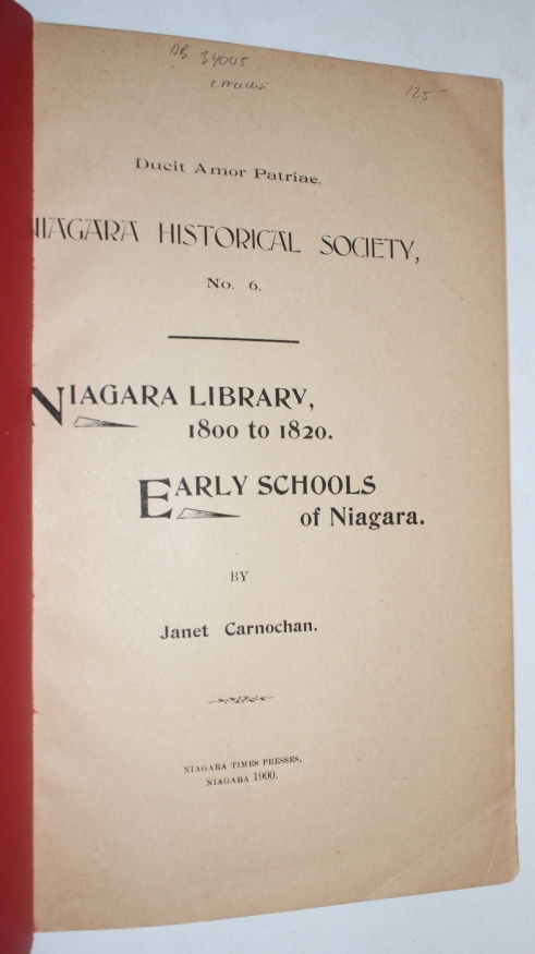 Niagara Library, 1800 to 1820. Early Schools of Niagara. (IN): Niagara Historical Society, No. 6.