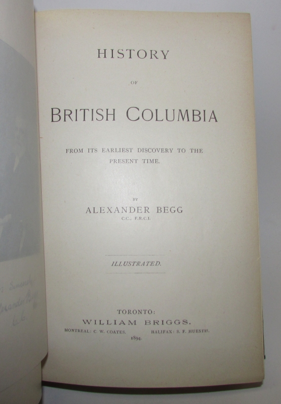 BEGG, Alexander. History of British Columbia from its Earliest Discovery to the Present Time. . First edition. 8vo., orig. green cloth, xvii, (1), (7)-568pp. With numerous illustrations in the text and a folding map. Fine. Lande 945; Lowther 1097.