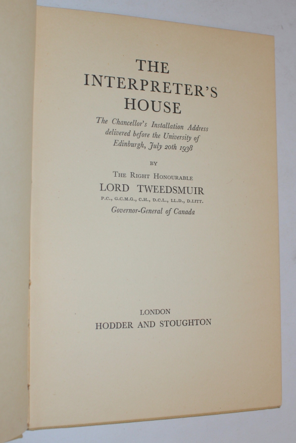 (BUCHAN, John). TWEEDSMUIR, Lord. The Interpreter's House. The Chancellor's Installation Address delivered before the University of Edinburgh, July 20th, 1938 by...