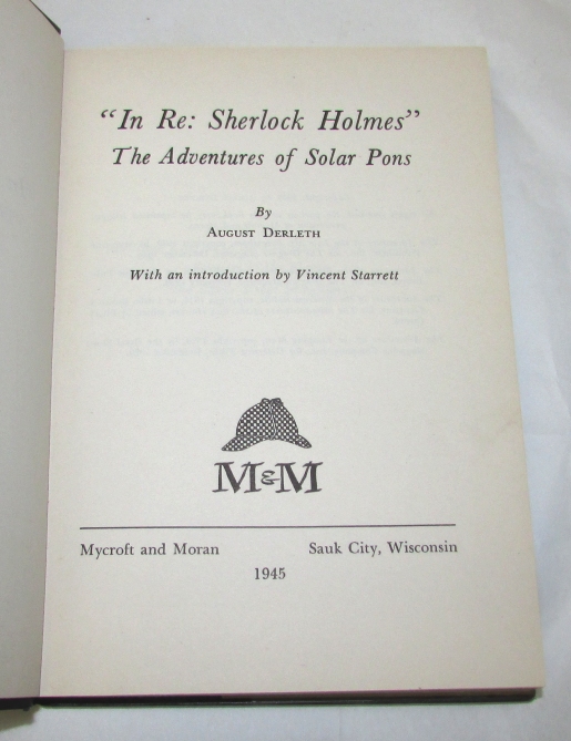 DERLETH, August. ?In Re: Sherlock Holmes? The Adventures of Solar Pons. With an introduction by Vincent Starrett.
