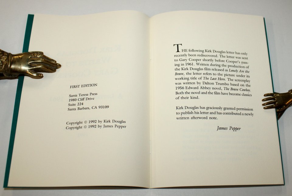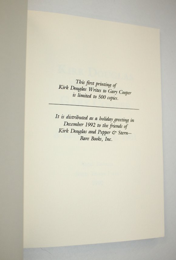 'Distributed as a holiday greeting in December 1992 to friends of Kirk Douglas and Pepper & Stern Rare Books', this booklet reprints a letter Douglas wrote to Cooper when the former was making Lonely Are The Brave. $100 CAD
