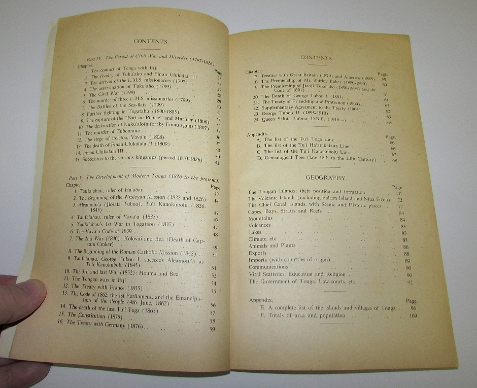 Contains information on the early history of Tonga, European contact and the period of civil war and disorder, the development of modern Tonga, geneaology.